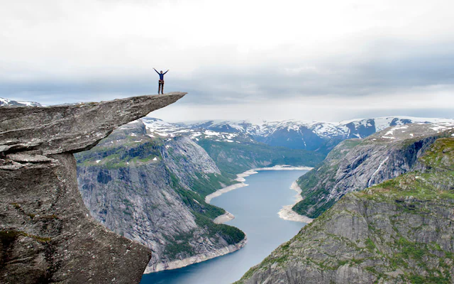 culmina en una lengua de roca suspendida sobre el fiordo, un lugar que se ha convertido en